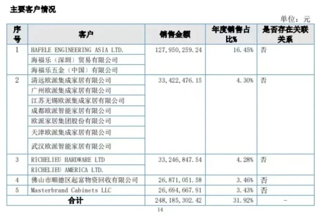 根据公转书披露华融配资,2024年上半年公司前三大销售客户分别是HAFELE ENGINEERING ASIA LTD.、欧派家居集团股份有限公司、广州中轻进出口有限公司。销售额分别是7635.49万元、1465.61万元、1281.25万元。